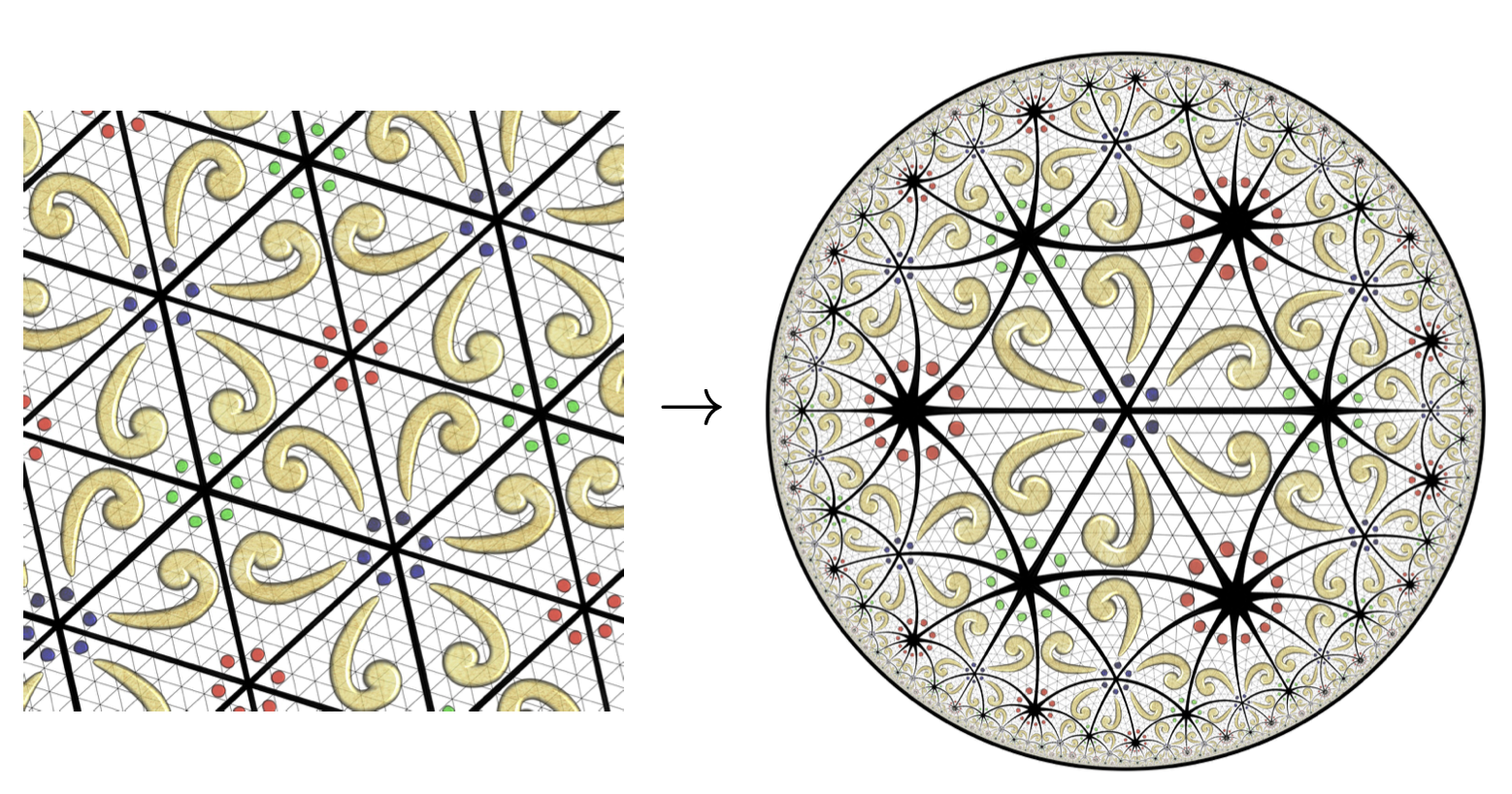 This entry refers to an article jointly written by Aaron Montag, Tim Reinhardt and Jürgen Richter-Gebert about the possibility to transfer Euclidean ornamental patterns to hyperbolic (Cicle-Limit like) symmetric patterns. We discuss the geometry and combinatorics of the problem and also present a GPU based algorithm that performs the transofmration. At the same time this algorithm is extremely simple to implement and provides smooth and fluid transitions from one combinatorial type to another. You can access the animations here.