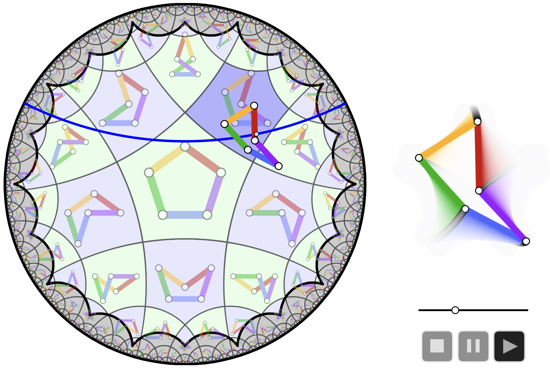This entry refers to an article by Jürgen Richter-Gebert about the cobfiguration space of the equilateral pentagon. There the problem of representing the space of all configurations of five cyclically attached bars of equal length is studied. Surprisingly, it turns out that this space can be represented and structured by a hyperbolic (5,4) tiling. Alongside with the intriguing combinatorics of the situation the paper studies a way to comformally identify the paramter space of the linkage with the Poincaré disk. You can access the animations here.